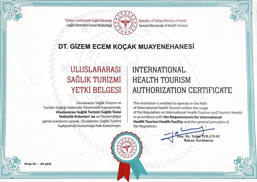Tesisimiz, Uluslararası Sağlık Turizmi ve Turistin Sağlığı Hakkında Yönetmelik kapsamında, Uluslararası Sağlık Turizmi Sağlık Tesisi Yetkinlik Kriterleri'ne ve Yönetmeliğin genel esaslarına uyarak, Uluslararası Sağlık Turizmi faaliyetinde bulunmaya hak kazanmıştır. Uluslararası Sağlık Turizmi Yetki Belgesi, Türkiye’de sağlık turizmi faaliyetlerinde bulunmak isteyen hastaneler, klinikler, poliklinikler ve aracı kurumlar için T.C. Sağlık Bakanlığı tarafından verilen resmi bir belgedir. Bu belge, sağlık kuruluşunun uluslararası standartlarda hizmet verdiğini, gerekli altyapı, donanım ve personel yeterliliğine sahip olduğunu kanıtlar. Aynı zamanda yurt dışından hasta kabulünde güvenilirlik sağlar ve sağlık turizmi sektöründe yasal olarak faaliyet göstermenin ön koşuludur. Sağlık Turizmi Yetki Belgesi ve HealthTürkiye Portalı süreçlerimiz VİA Danışmanlık tarafından yürütülmektedir.